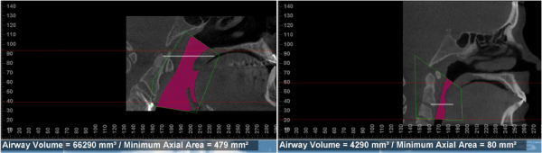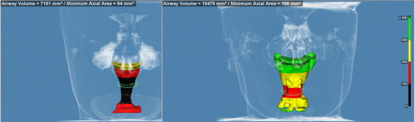 The purple zone is the airway of two different people. The one on the left has a total volume of about 66,000 mm, while the one on the right has a volume of about 4,000 mm.