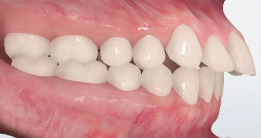 When the tongue thrusts forward during swallowing, this can result in an anterior open-bite where the top and bottom front teeth do not bite together fully. The tongue can also thrust posteriorly or laterally. This can result in an open-bite or cross-bite at the back teeth, and often contributes to a deep overbite of the front teeth.